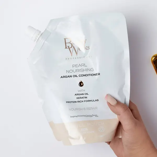 A conditioner refill pouch for nourishing all hair types and maintaining hair extensions.