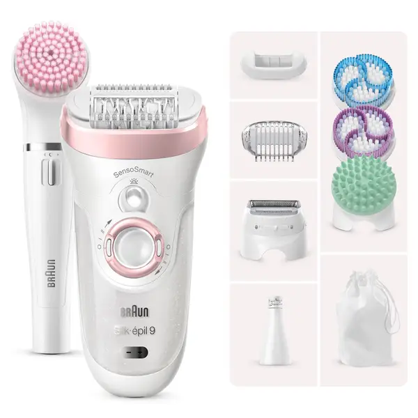 The Braun Silk-épil 9 9-985 Beauty Set features a deluxe 9-in-1 hair removal kit for the face and body. Equipped with a wide head epilator and FaceSpa, the set offers epilation, shaving, trimming and exfoliation.